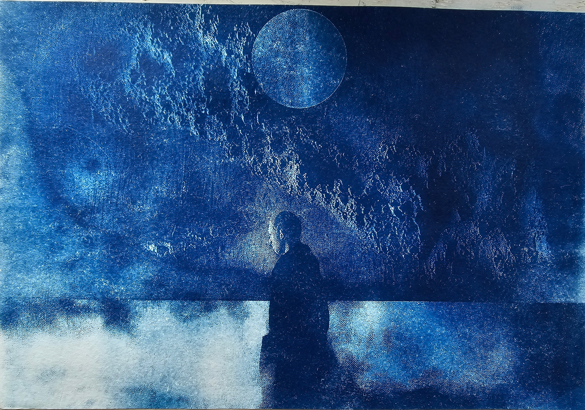 Работы выполнены в технике цианотипии на ткани. Синий цвет, лежащий в основе этой техники, органично перекликается с названием резиденции «Между водой и небом». Для меня он символизирует внутреннюю тишину, глубину самопознания и пространство для обновления — как небо и вода, встречаясь, создают точку баланса и новых смыслов.