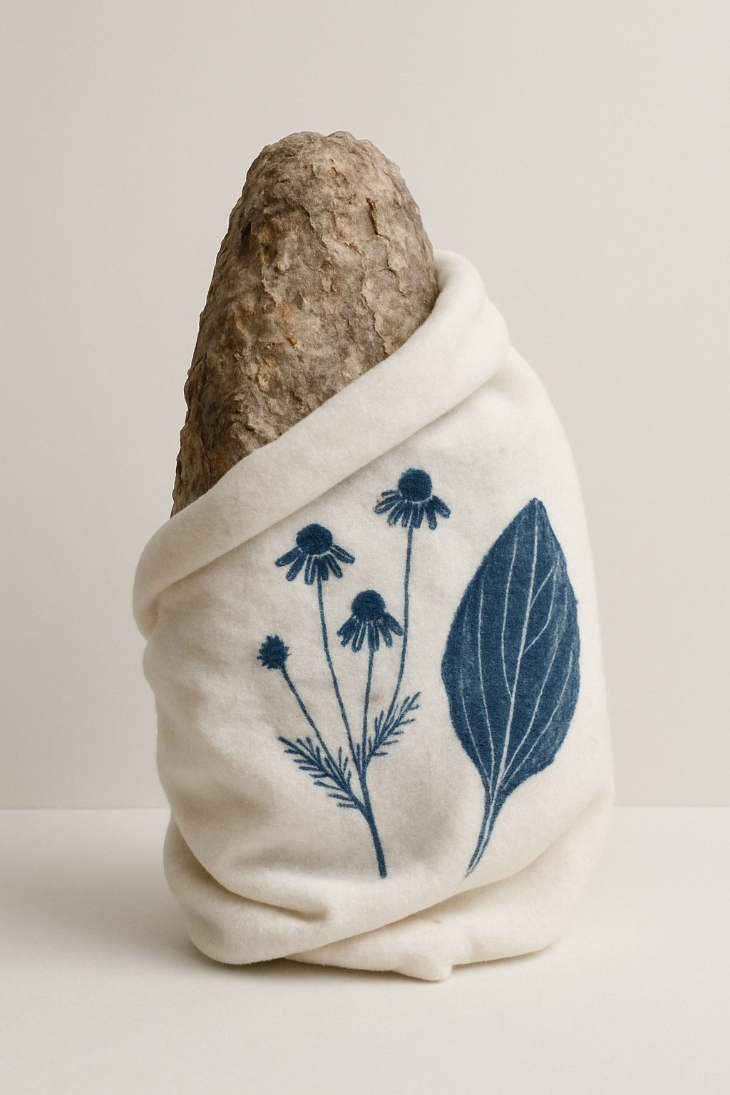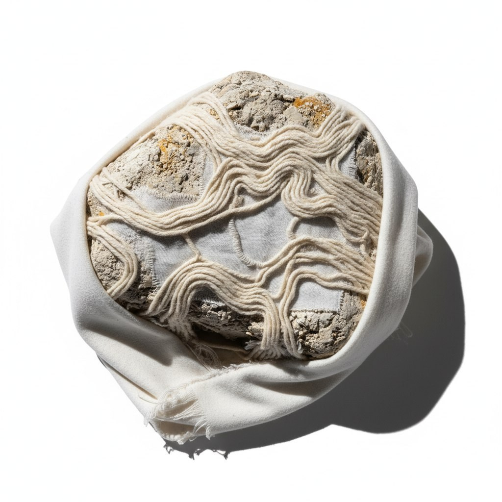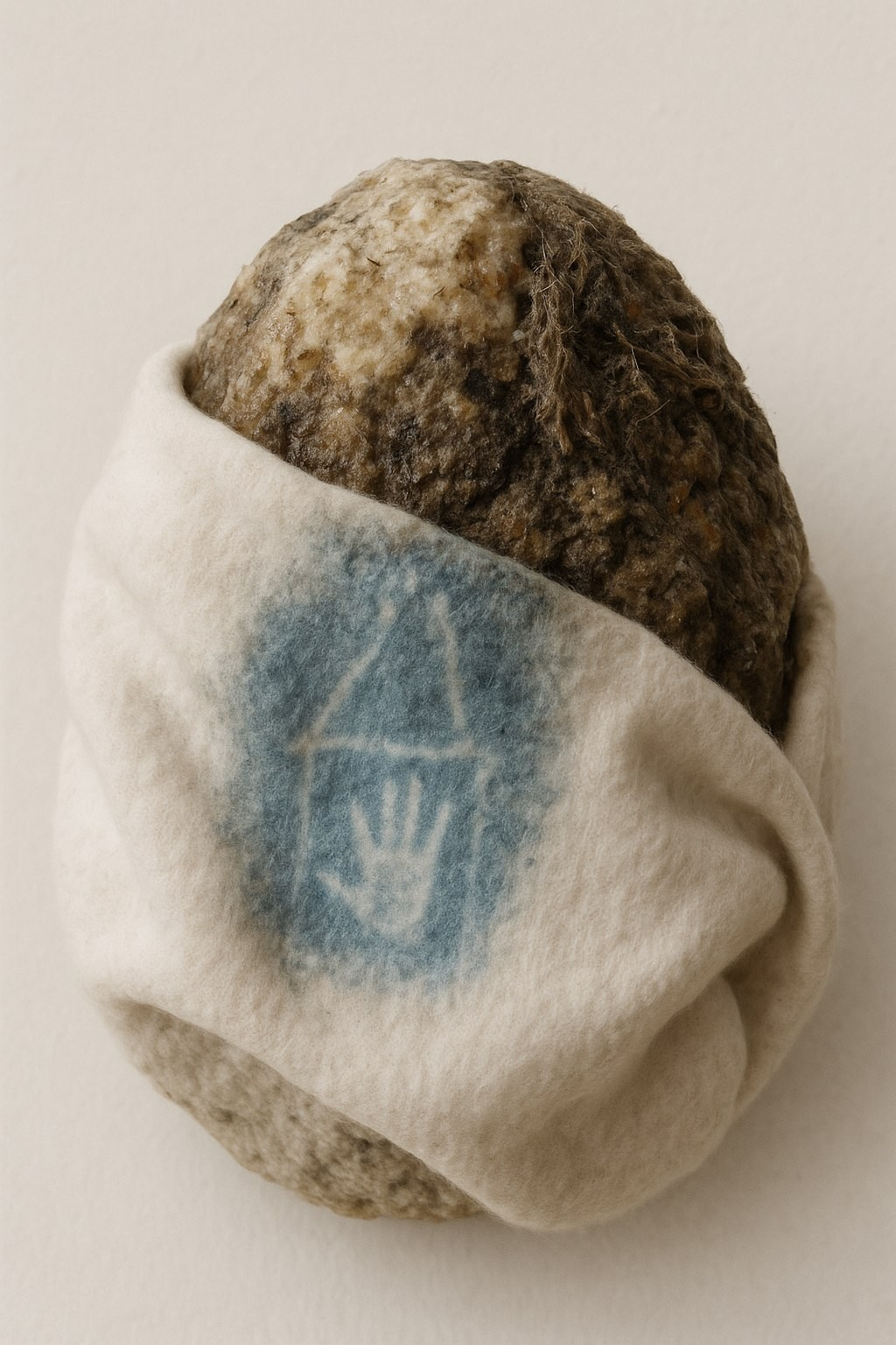 Работа изучает механизм тактильной интеграции травмы — как физическое взаимодействие с метафорическими «окаменелостями» памяти через мягкие, нежные материалы (пеленка, цветы) может трансформировать их из чужеродных элементов в принятые части личной истории. Это исследование перевода травматического опыта из состояния отчужденного объекта в состояние интегрированного воспоминания через язык материальности и жеста.