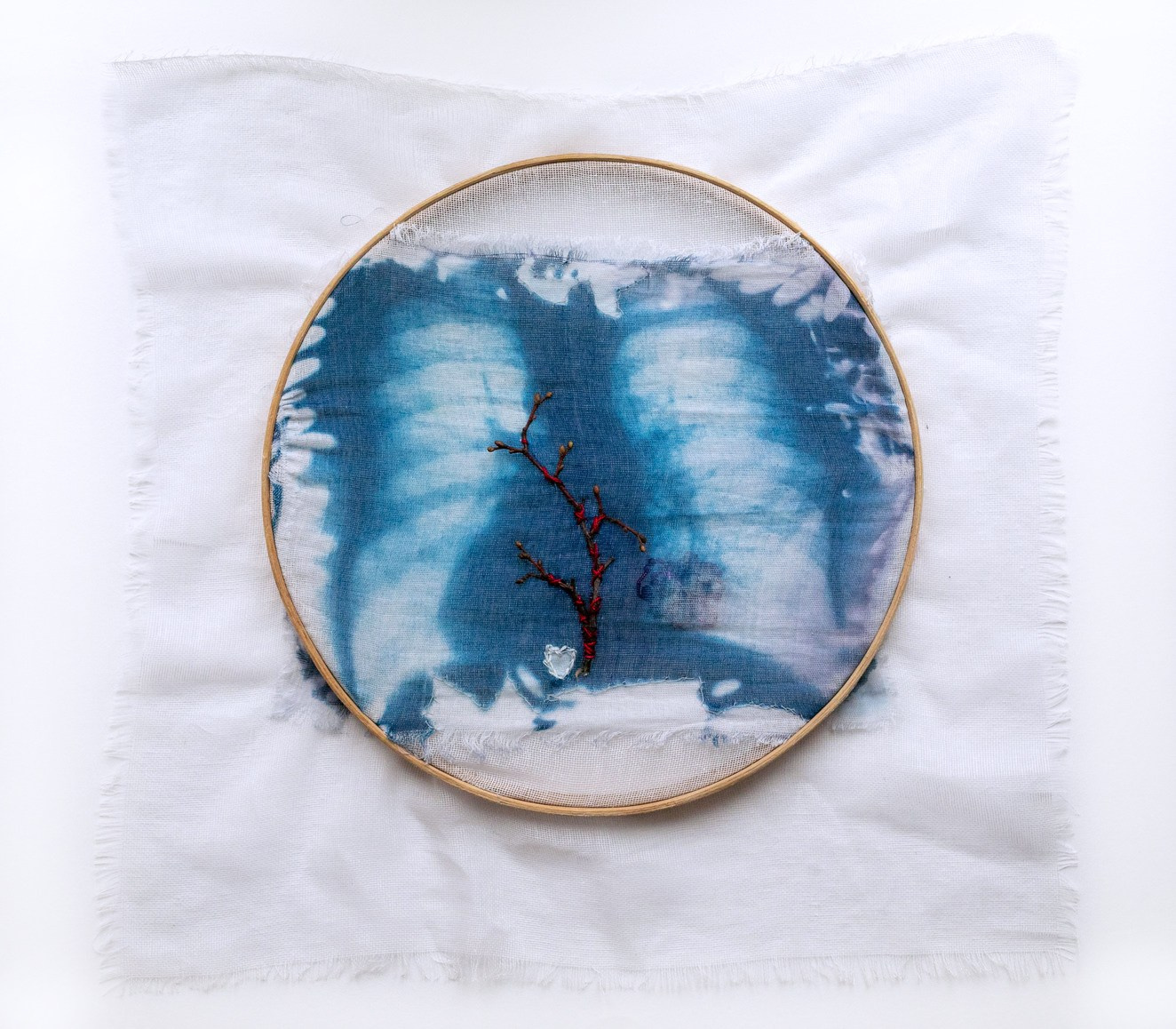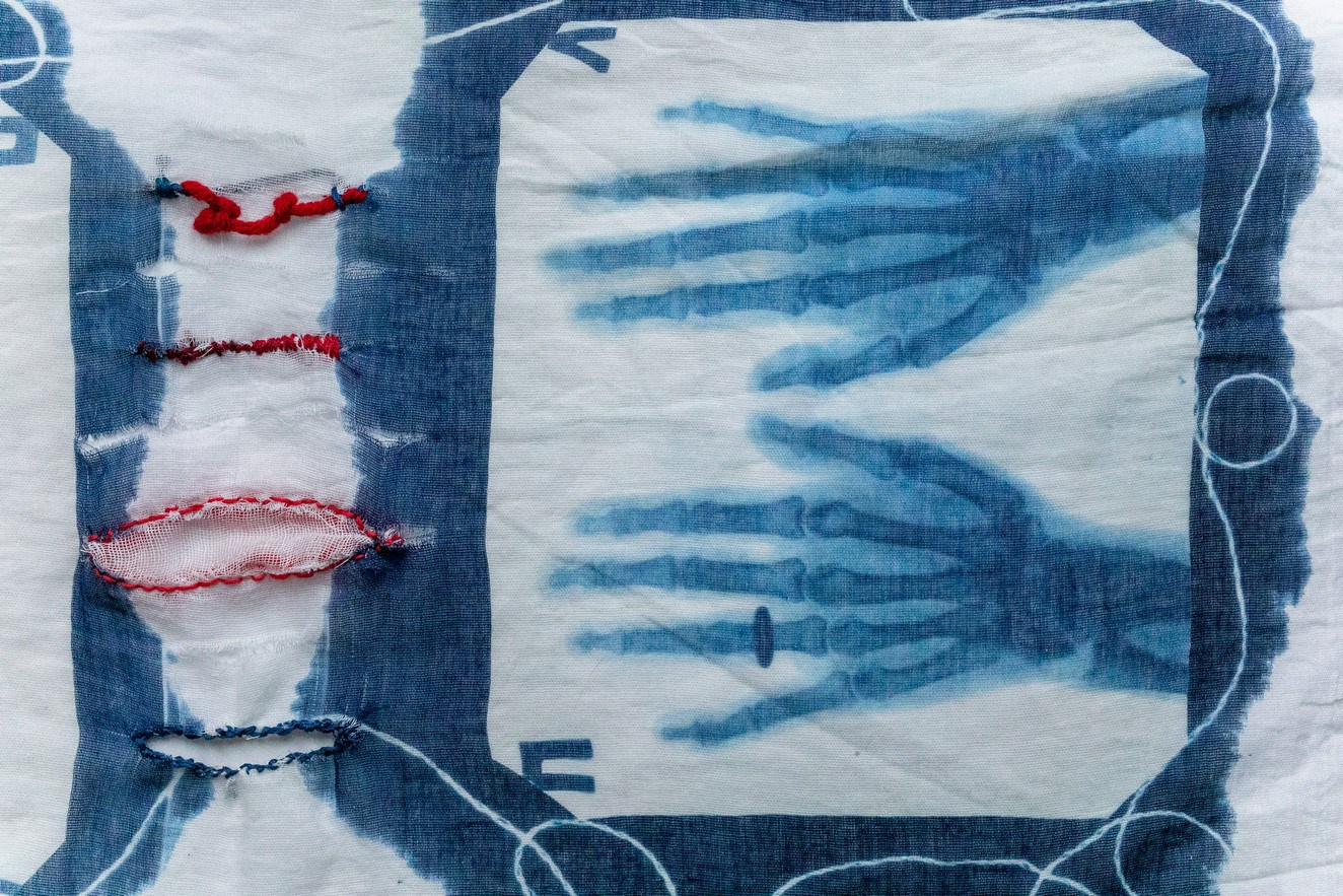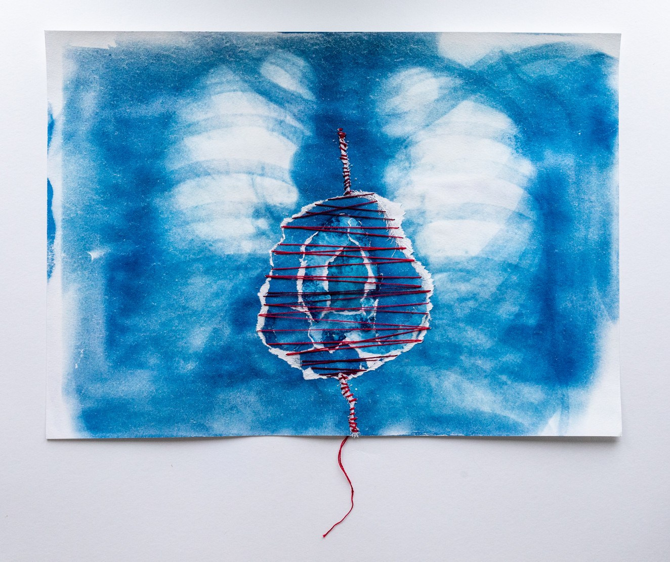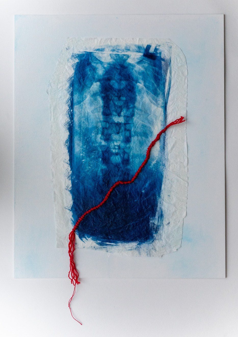 Я называю свой метод соматической археологией. Через рентгеновские снимки и технику цианотипии я визуализирую скрытые структуры памяти. Процесс напоминает отпечаток — так невысказанное впечатляется в телесную организацию. Тактильные материалы: нити, природные элементы, пластик — становятся аналогами нервных связей и психосоматических блоков.